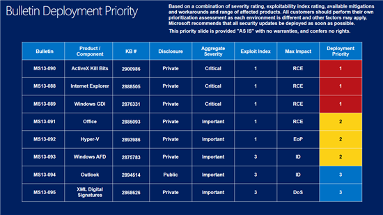 For more information about this month's security updates, including the detailed view of the Exploit Index broken down by CVE, visit the Microsoft Bulletin Summary Webpage.